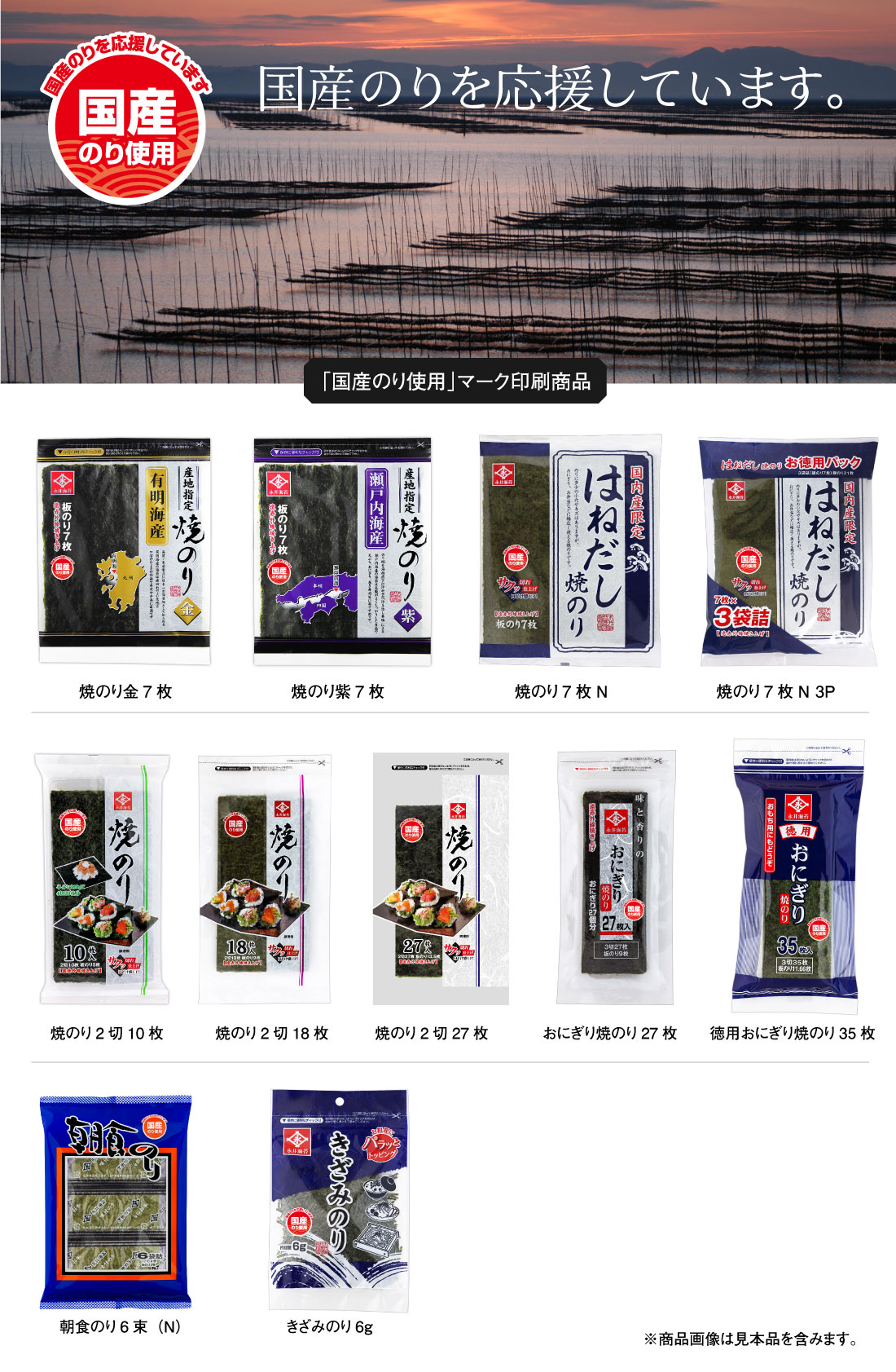 昨今の海苔市場では、海苔高騰、価格改定で海外産の海苔を使用した商品が多くなっております。そのような状況の中、弊社では味と香りの優れた国産のりにこだわって商品づくりを行っています。 この度、国産のり生産者の意欲を高める機会の創出、 及び国産のりの販売強化の一環として下記商品に「国産のり使用」のロゴマークを印刷して展開致します。 このマークは、生産者の方や海苔が好きな皆様への思いを込めた印です。